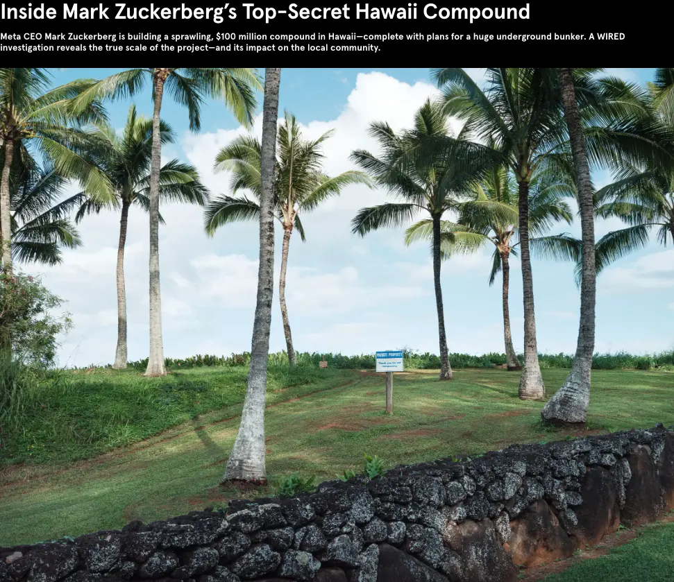 根據美國Wired雜誌報道,在夏威夷考艾島上,Zuckerberg正在進行一項耗資1億美元的龐大建築項目,總佔地面積達到560萬平方米。