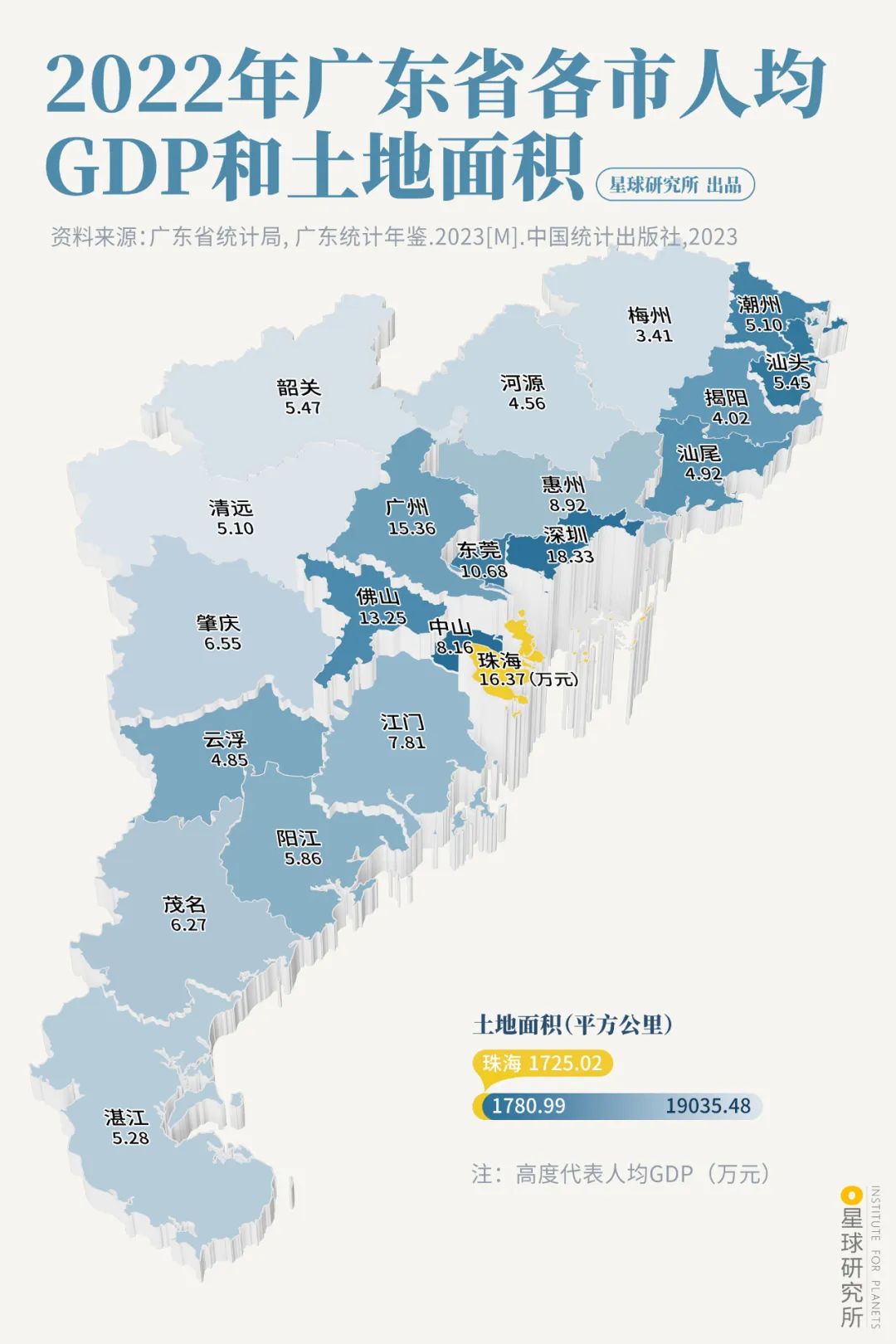 (2022年廣東省各市人均GDP和土地面積,製圖@馮藝卓/星球研究所)