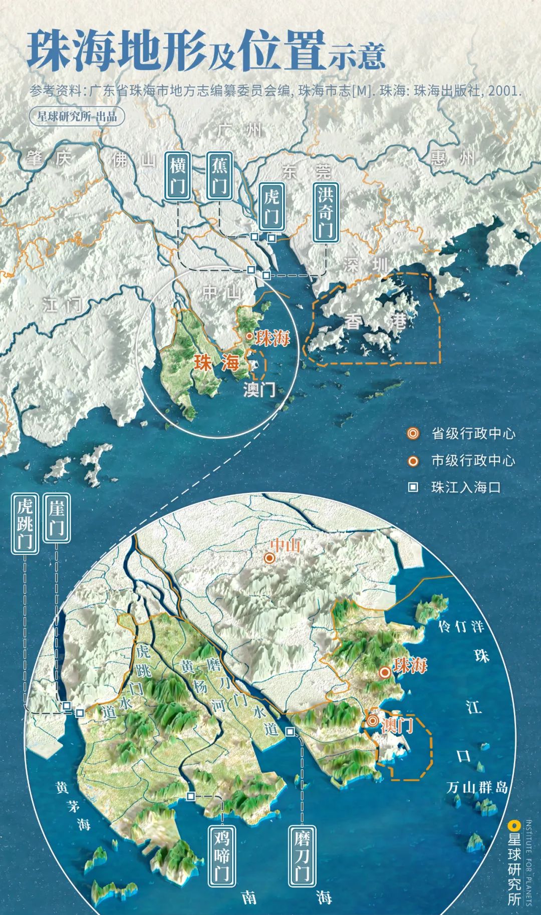 (珠海地形及位置示意,珠江經位於珠海的磨刀門、雞啼門、和鄰近的崖門、虎跳門出海,製圖@高儷倩/星球研究所)