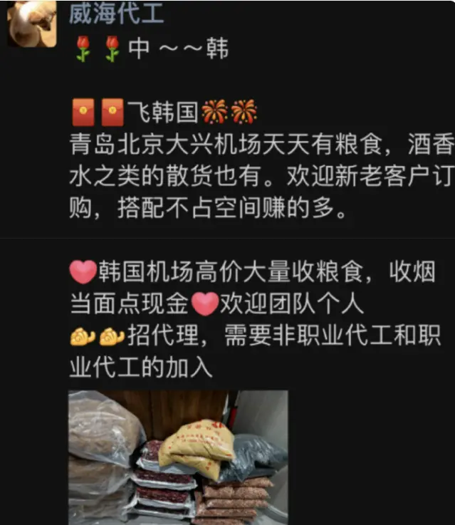 極短的時間內這個行業就已經形成了產業鏈,有人負責在青島機場賣糧食,有人負責在韓國機場收糧食。