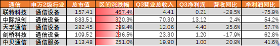 圖:通信行業漲幅前五標的,來源:Choice金融客户端,錦緞整理 單位:億元