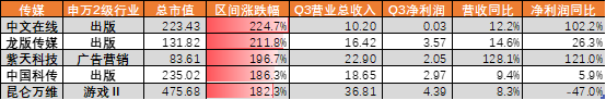 傳媒板塊的上漲除了概念要素外,也疊加了業績基本面向好的趨勢,前三季度傳媒行業平均營收增速達到5.8%,利潤增速更是達到了23.3%。
