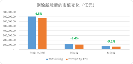 剔除新股後整體來看,所有板塊都表現疲軟,主板+中小板的總市值較年初下降4.5%,創業板總市值較年初下降8.4%,科創板總市值下降達到9.1%。