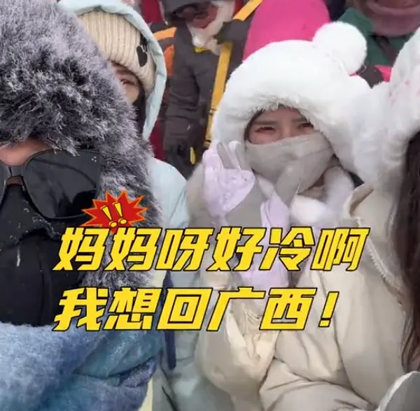 一邊是睫毛上霜、只露眼睛都能看出凍透了的遊客們在鏡頭前高喊:“太冷了!我想回南方!”