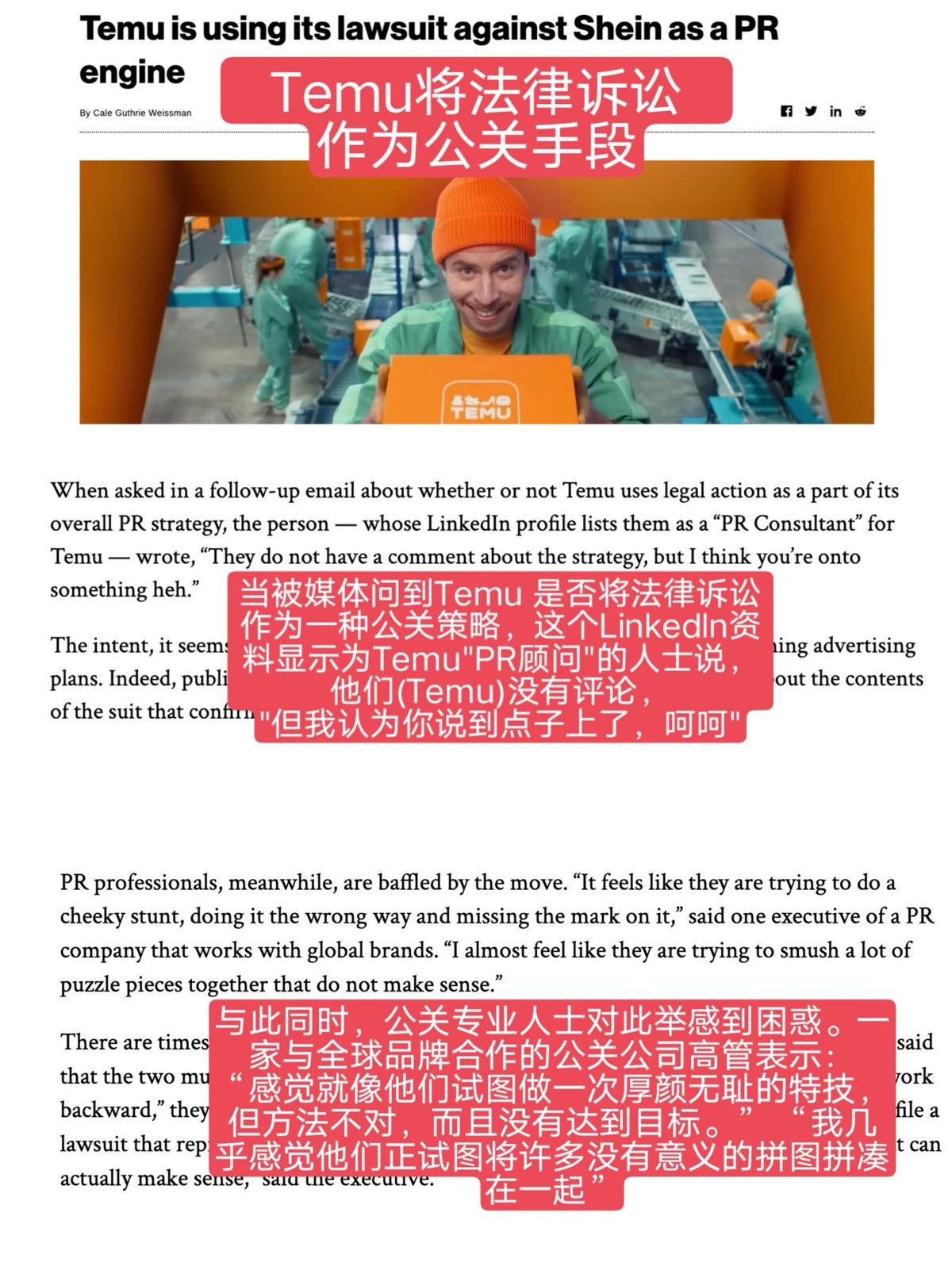 關於雙方的訴訟結論如何,法律的交給法律,由司法部門來做判決。但是就連國外的媒體們都看出了其中的“異樣”。當被媒體問到Temu是否將法律訴訟作為一種公關策略,這個Linkedin資料顯示為Temu “PR顧問”的人士説,他們沒有評論,但我認為你説到點子上了,呵呵。一家與全球品牌合作的公關公司高管表示:感覺就像他們試圖做一次厚顏無恥的特技,但方法不對,我幾乎感覺他們正試圖將許多沒有意義的拼圖拼湊在一起。