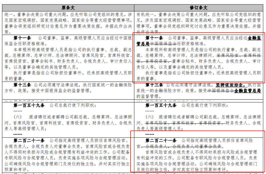 公司章程第十一條內容顯示,原章程中所稱高級管理人員中,“首席風險官、首席科技官、首席投資官”三個職位被刪除。