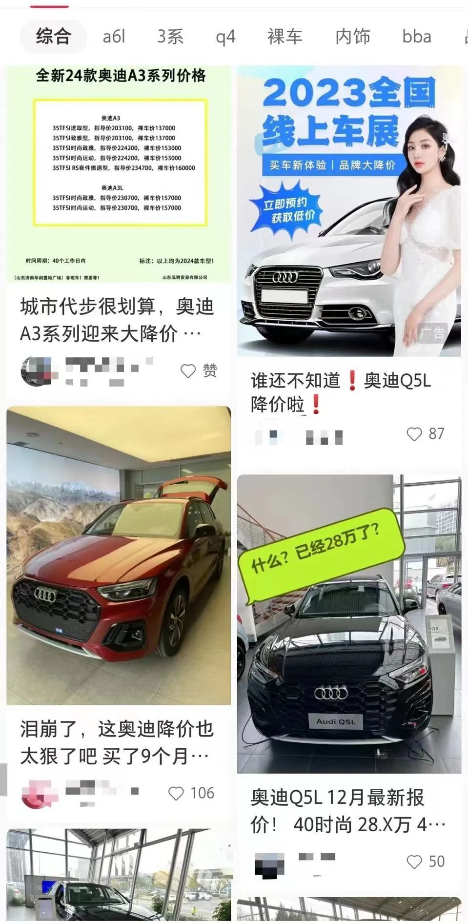 費渡表示自己被奧迪降價的廣告包圍了。即使關閉了小紅書,但是抖音、微博等其他平台也都是奧迪鋪天蓋地的廣告。“大概是年底衝量,奧迪銷售在一小時內打了三個電話讓我來試駕。即使拒絕了小王,還有小宋、小劉來邀約我試駕。”