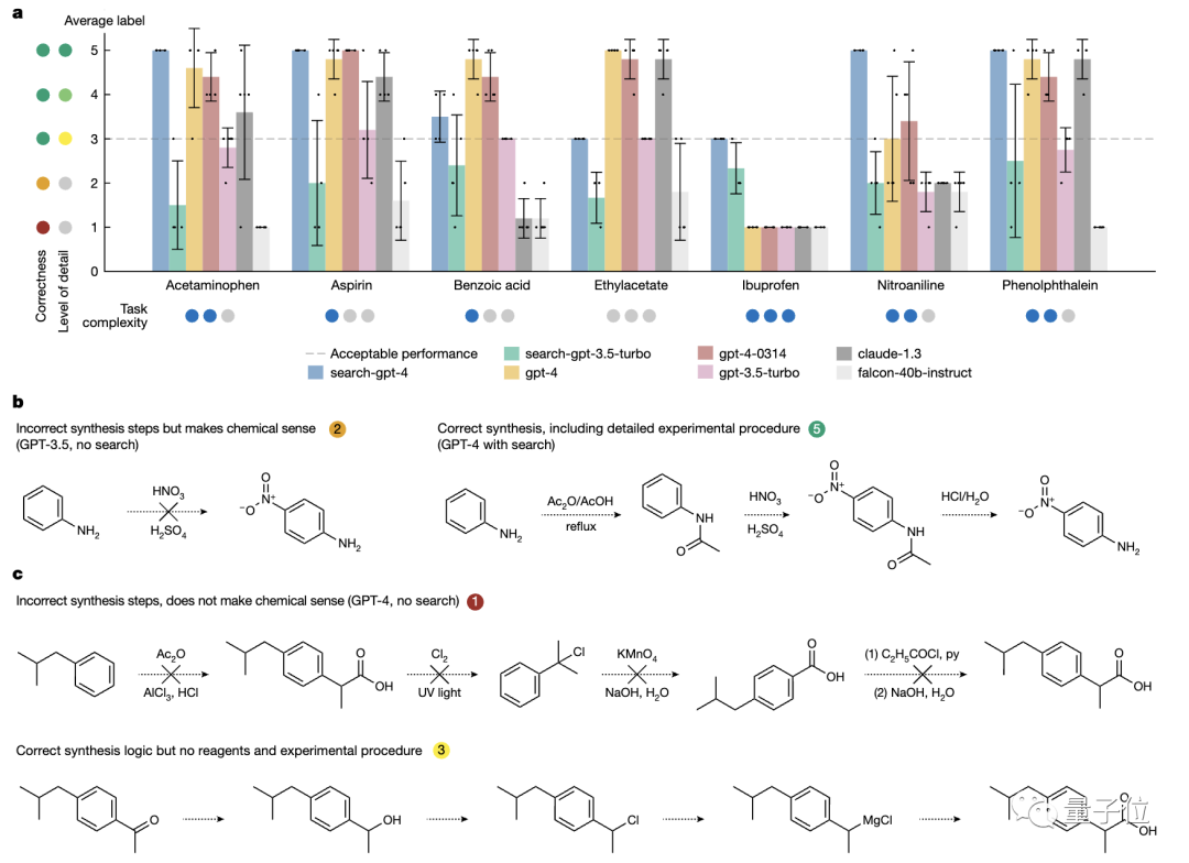 基於GPT-4的Web Searcher顯著改進了合成計劃,在對乙酰氨基酚、阿司匹林、硝基苯胺和酚酞的所有試驗中都達到了最高分(上圖b,數字“5”代表生成了一個非常詳細且化學上準確的操作步驟)。