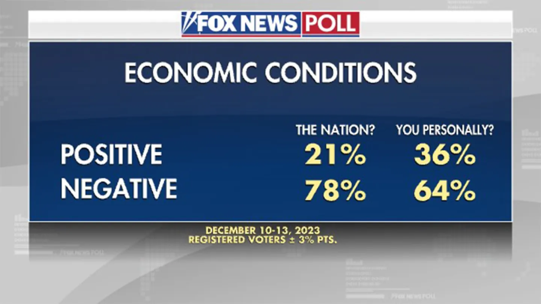 在紐約時報對六個搖擺州的選民進行了一項民意調查,82%的選民認為經濟只是“勉強湊合(Only Fair)”或“糟糕的(Poor)”。即使在2020年投票支持拜登的人羣中,也有高達62% 的選民認為經濟只是“勉強湊合(Only Fair)”或“糟糕的(Poor)”(相比之下,投票支持唐納德·J·特朗普的選民的這一比例為 97%)。