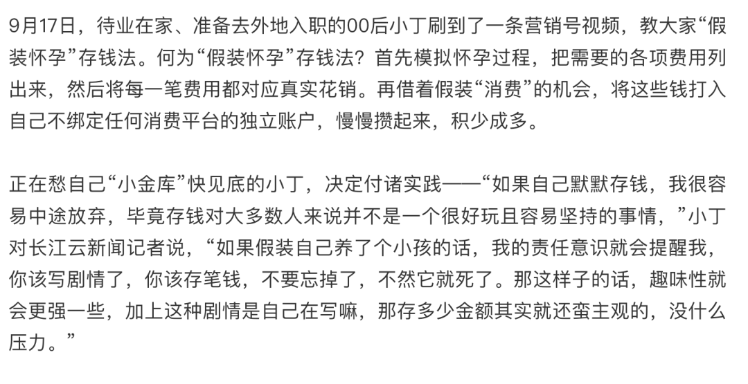但是很快她們都開始蠢蠢欲動,從質疑、理解到加入,“虛擬懷孕存錢法”太上頭了,那些細緻的教程讓人彷彿真的跟着雲體驗40周孕期的全流程。