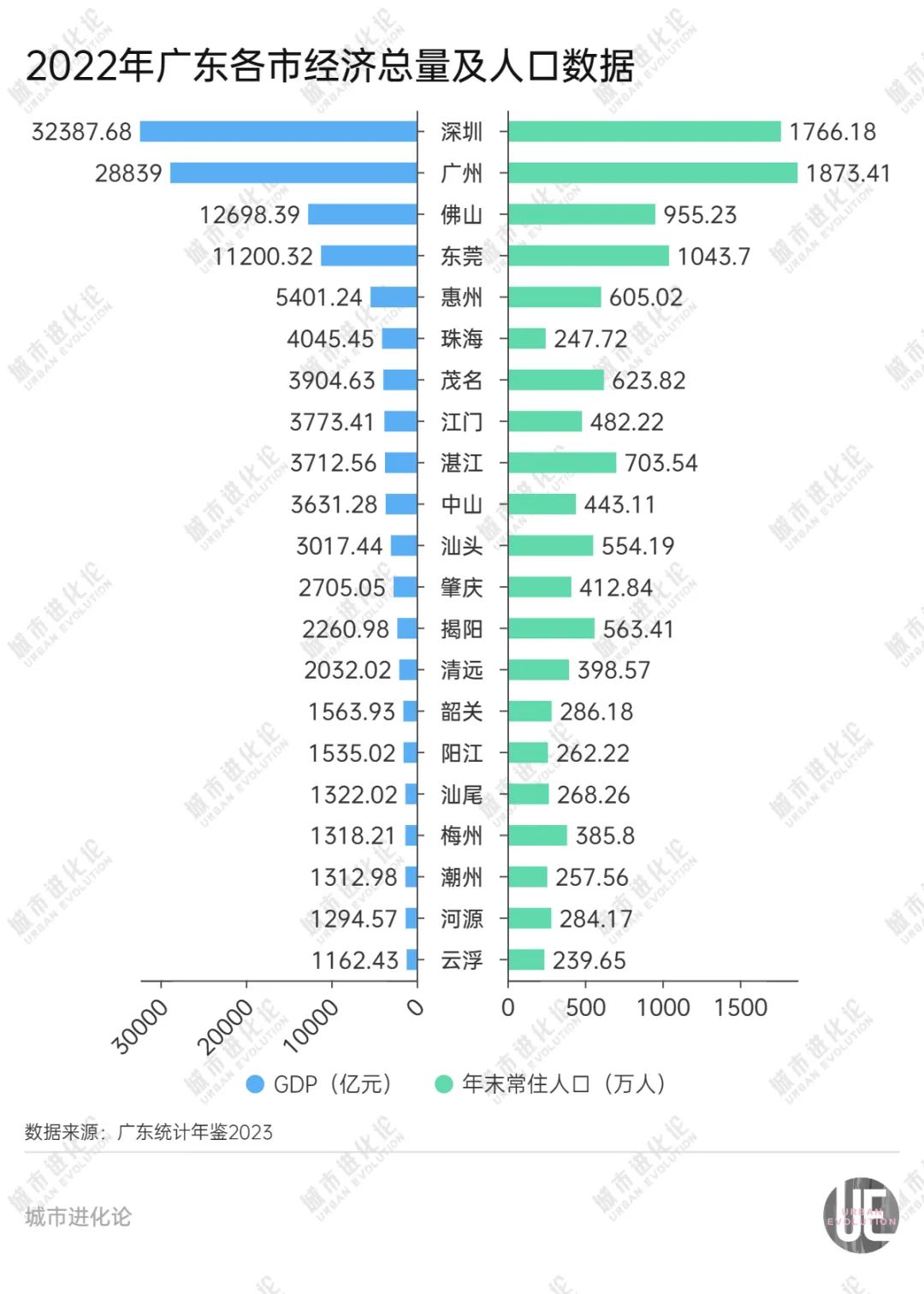 反觀珠海、湛江、汕頭,2022年經濟體量分別只有廣東全省的3.13%、2.88%和2.34%,且在全省排在第6、第9和第11的位置。