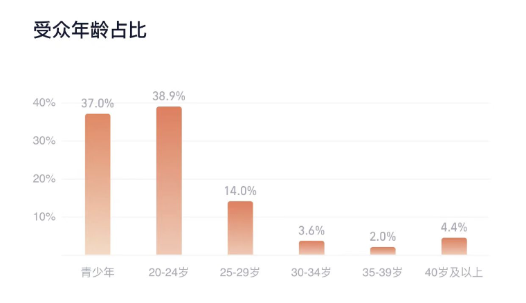 其中,主要的受眾年齡佔比,20~24歲佔比38.9%,20歲以下的青少年佔據了37%。