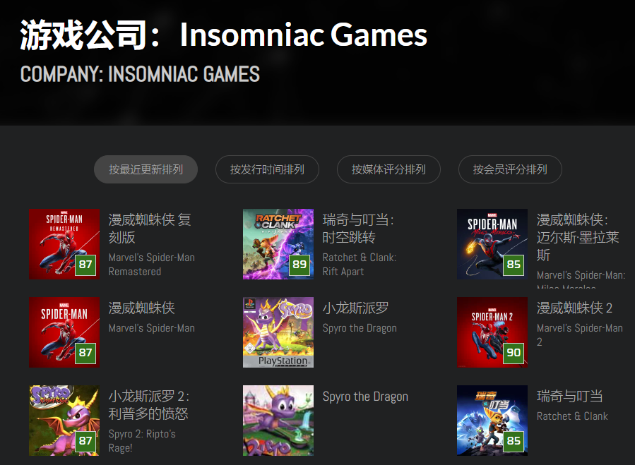 Insomniac Games ( 失眠組 )是索尼遊戲工作室旗下的遊戲開發商,效率高、肝好、質量還穩定的那種。