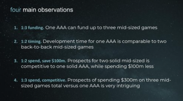 而在 “ 失眠組 ”2022 年初製作的一份內部 PPT 裏,展示了遊戲組對 3A 遊戲的研究:中等體量的遊戲相比 3A 遊戲,只需要三分之一的資金,以及一半的開發時間,但兩款中等體量遊戲的淨銷售額可以做到與一款 3A 遊戲近似,而三款甚至可能超過後者。