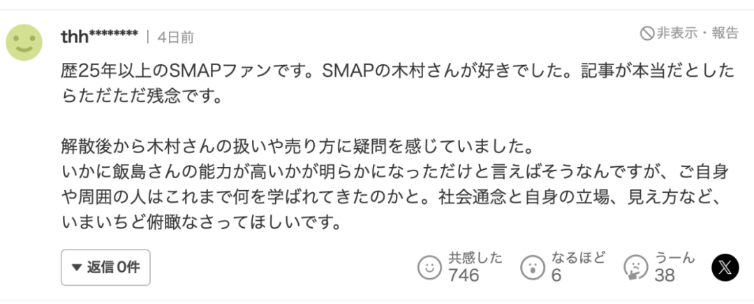 “我是SMAP的忠實粉絲,已經飯了超過25年,也喜歡過在SMAP裏的木村先生。如果報道是真的,那就太可惜了。組合解散後我對木村先生的職業規劃和營銷方式都產生了疑問,相比之下,飯島女士(SMAP經紀人)的能力明顯就厲害了,但是木村和周圍的人迄今為止都學到了什麼呢。希望他們都能重新審視自己的社會觀念、立場和看法。”
