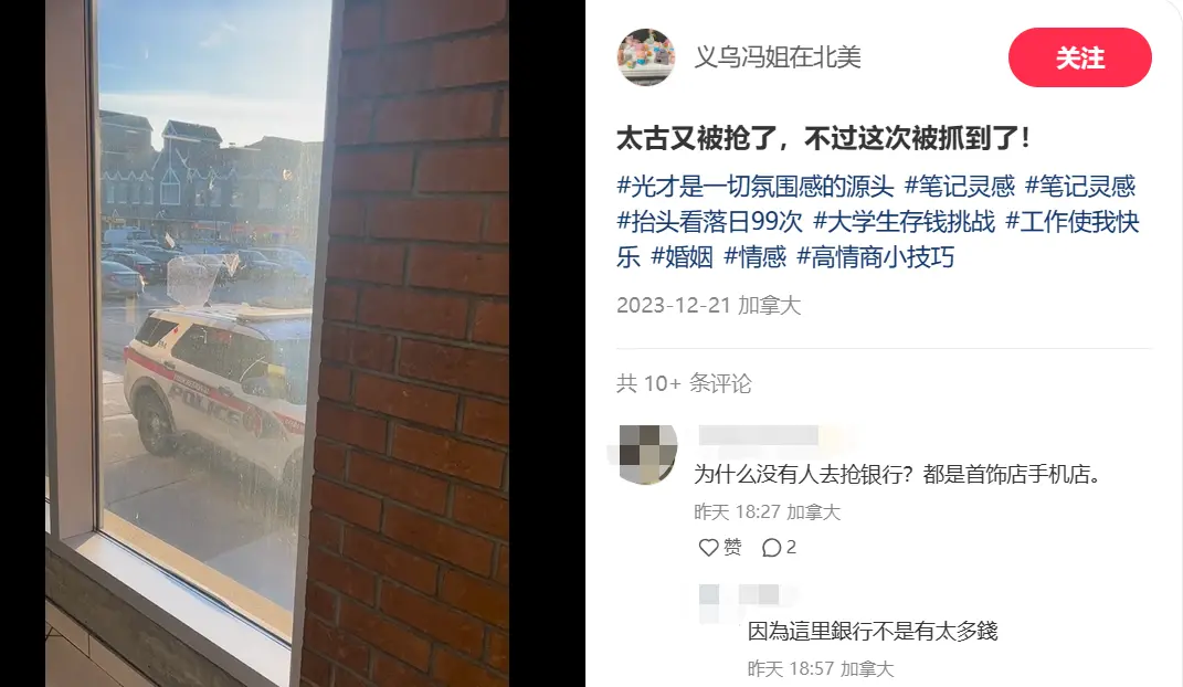 週四下午3:30分過後,網友@義烏馮姐在北美,在社交媒體上發帖説:“太古又被搶了,(劫匪)這次被抓到了!”