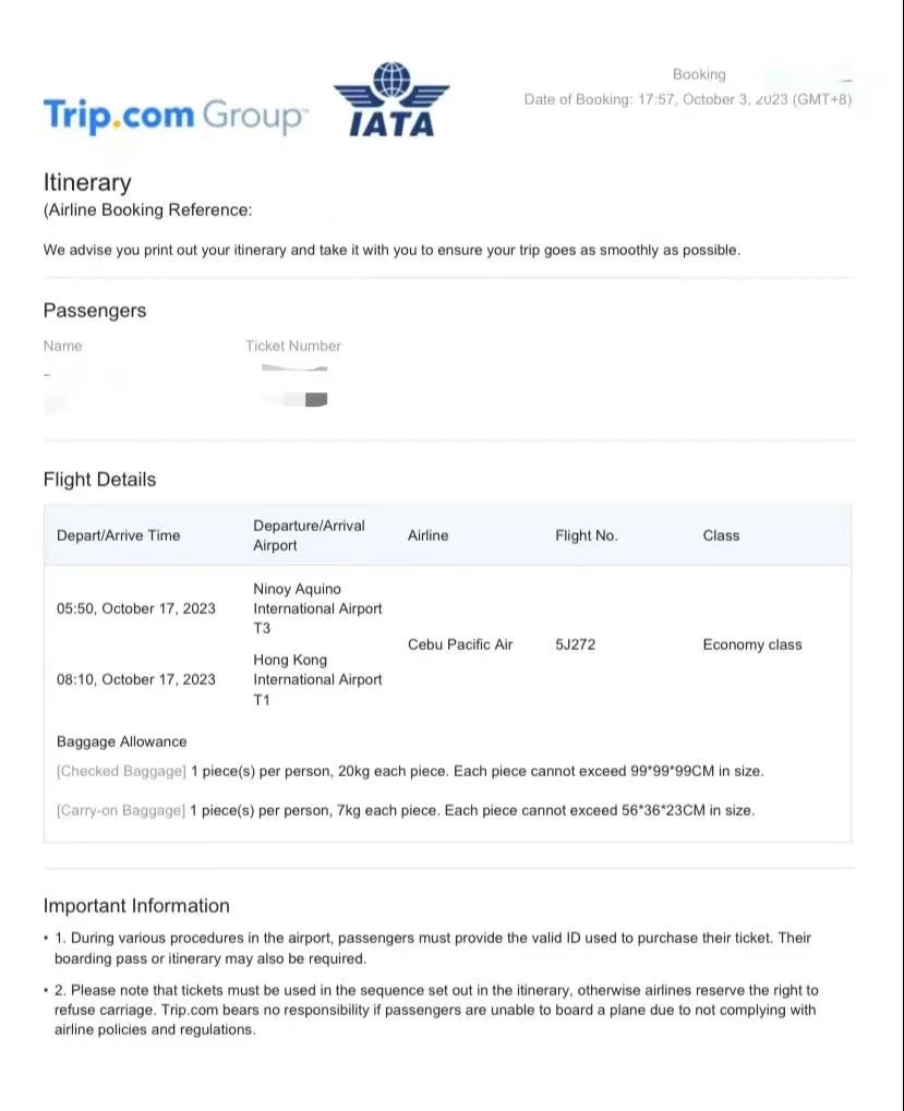 我給工人定了最早的一班飛機,5點多從馬尼拉到香港,帶托運行李20kg和手提7kg。