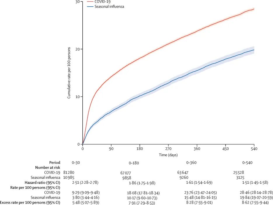 研究表明,雖然新冠病毒不斷變異、毒力有所下降,但針對不同毒株的分析顯示,隨訪30天、180天、360天和540天內,新冠感染者再住院、轉入ICU、死亡風險都高於季節性流感。相較於流感組,新冠感染組每100人有8.62例超額死亡。