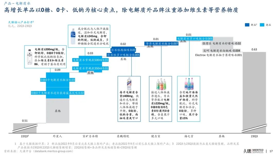電解質水賽道火熱,眾多行業巨頭和新品牌相繼佈局產品線,新進入品牌用低價佔領市場份額,且電解質水的受眾羣體增加,消費者更願意買小組數嚐鮮,平均單價小幅下降(23年Q3品類線上平均單價同比-14%),受銷量大幅上升驅動,品類市場規模持續上升(23年Q3品類線上銷售額同比+68%)