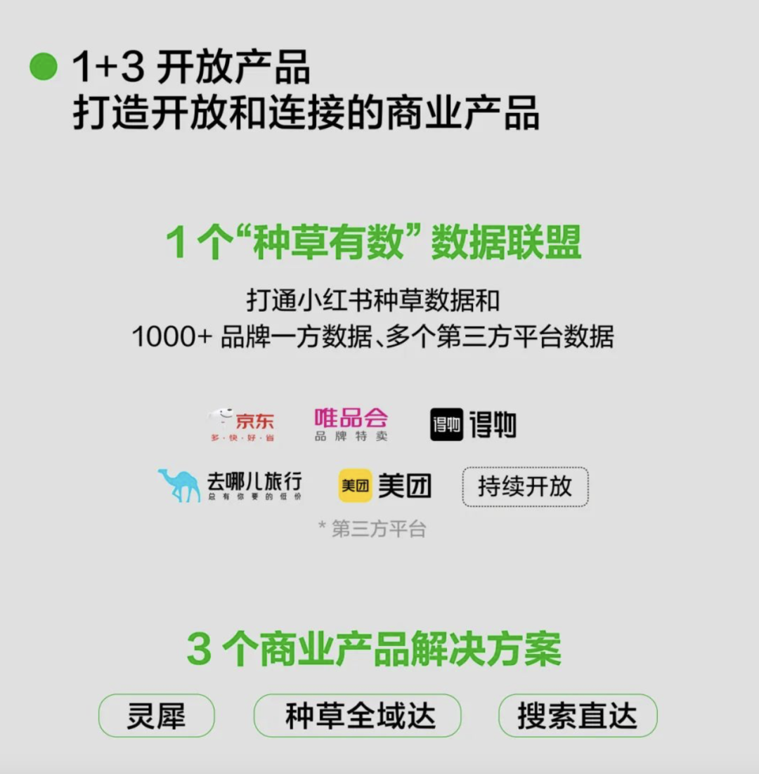 一是開放數據合作,成立了“種草有數·數據聯盟”,打通前鏈路的小紅書種草數據和京東、唯品會、得物、去哪兒、美團等後鏈路的平台數據,讓商家能把種草效果看清楚。