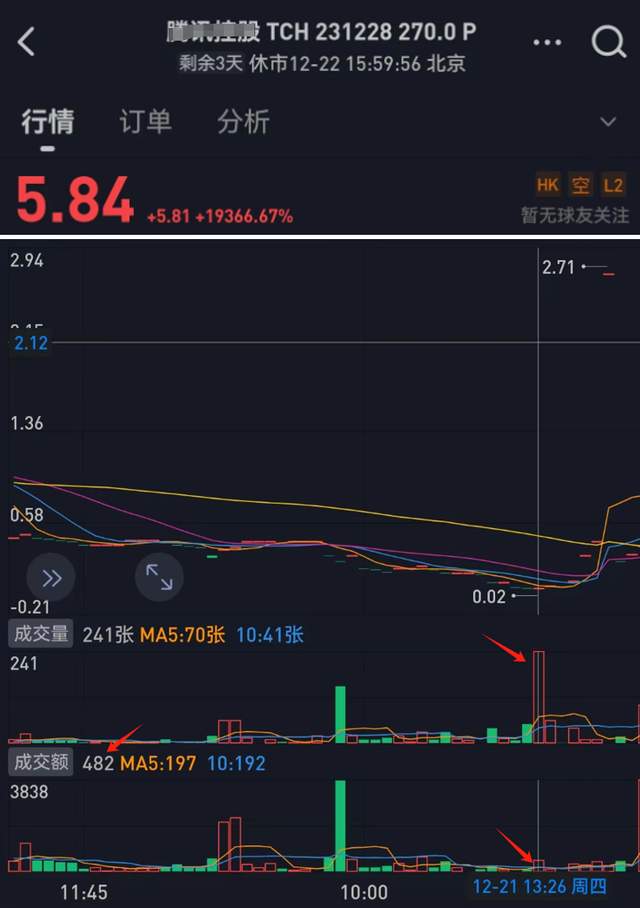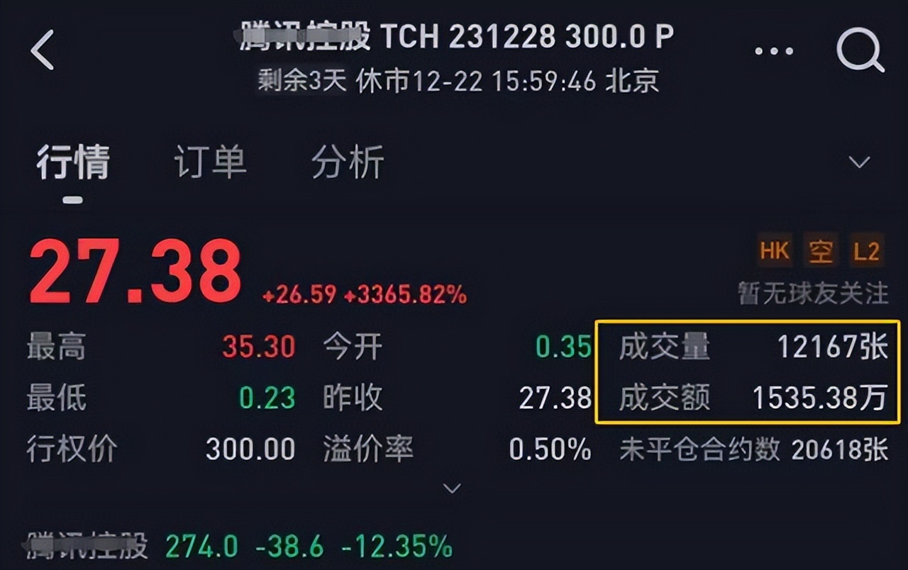 結果,這個視頻出來後,網絡上就開始流行一段説法稱“12月21號當天,有人買入6天企鵝認沽期權,超過1.2萬張,單張價格一塊不到。22號消息發佈之後,這個認沽期權最高漲到35塊港元,一天時間獲利超過30倍!”