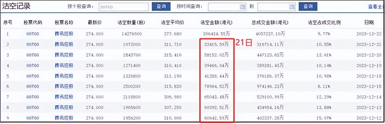 從港股企鵝的沽空記錄看,12月21日週四的沽空總金額並沒有異常增加,反而低於日均水平。