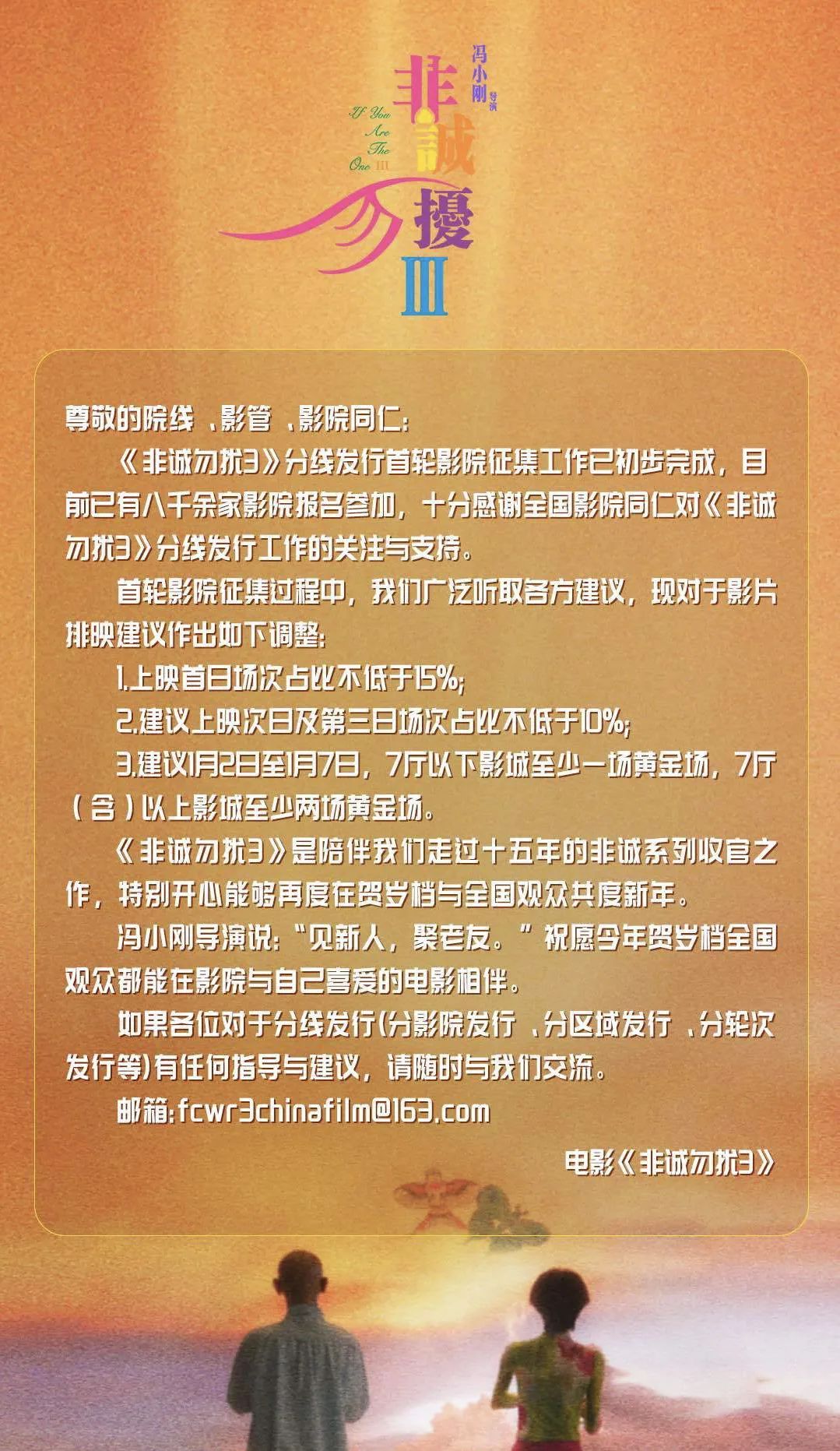 《非誠勿擾3》關於分線發行提出了幾點合作建議,要求上映首日場次佔比不得低於15%、次日及第三日不得低於10%,上映第三日至第九日,7廳以下的影院必須要安排一場黃金場,7廳以上的影院至少兩場黃金場,合作門檻定得非常高。