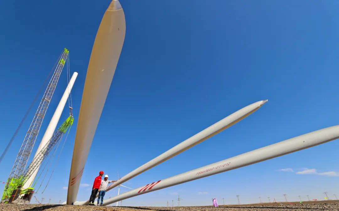 2022年9月7日,甘肅張掖,高台縣北部灘500兆瓦風電基地,工程技術人員正在對即將安裝的風力發電機葉片進行檢測。