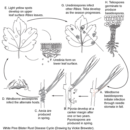 在春季,真菌在黑加侖等醋栗屬植物上形成孢子,這些孢子隨風傳播到白松樹上。孢子在白松的葉子上萌發,侵入樹木,隨後在樹幹形成皰疹,導致樹木死亡。真菌在白松上形成的孢子再次傳播到黑加侖等醋栗屬植物上,完成其生命週期。
