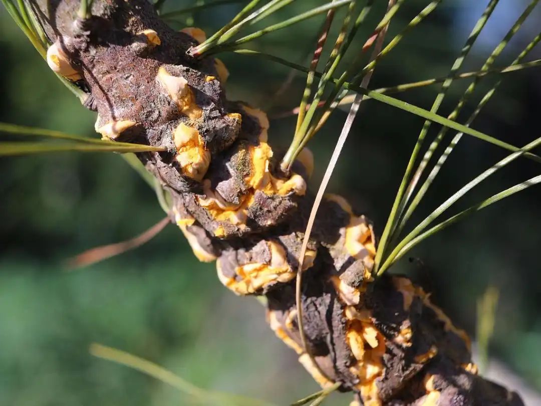 松樹的樹皮上覆蓋着由水皰鏽病感染引起的黃色潰瘍 圖源:Wikipedia