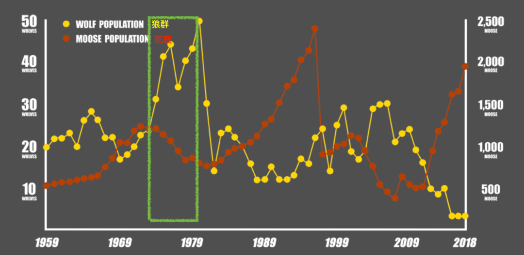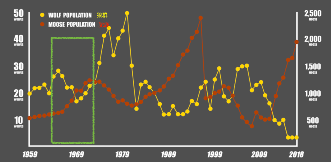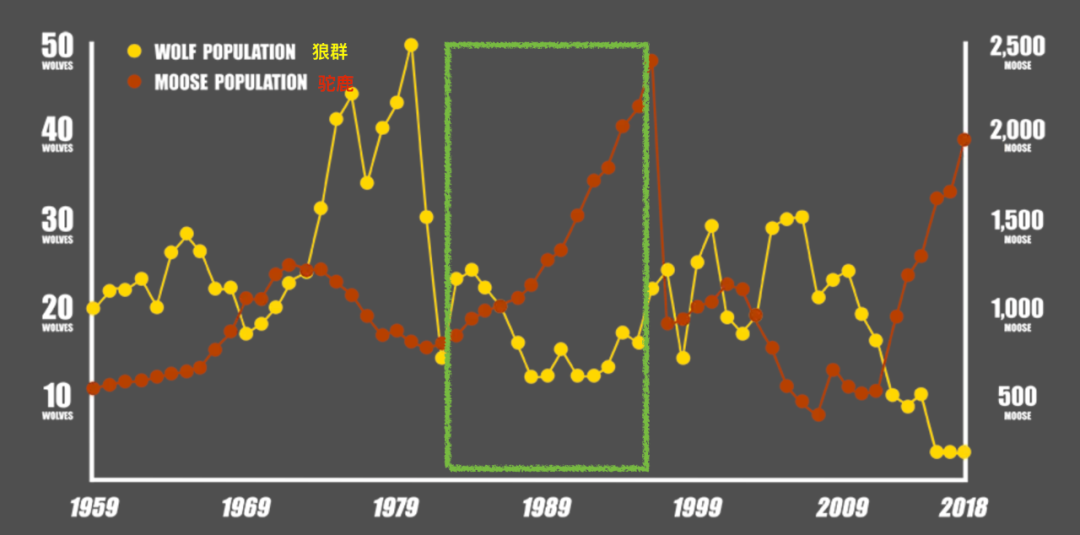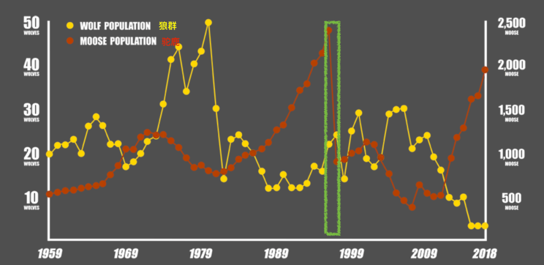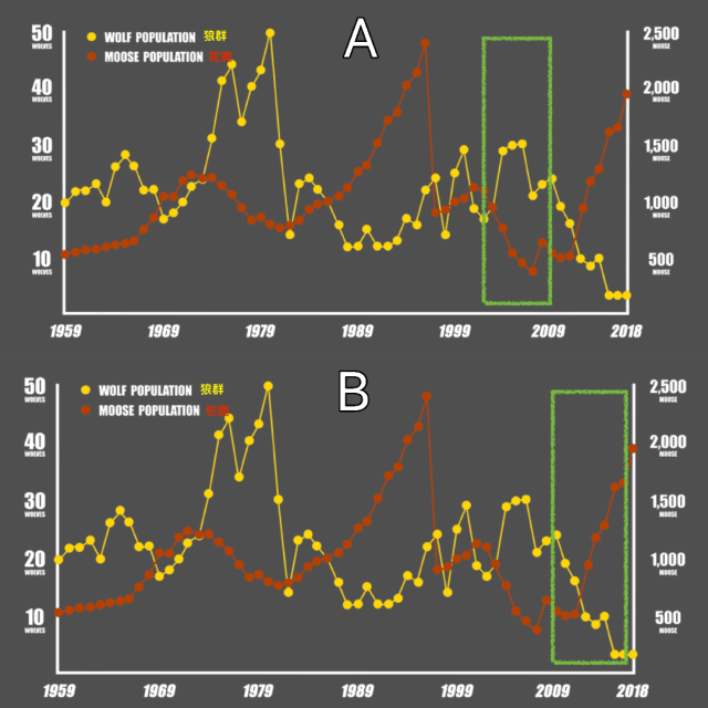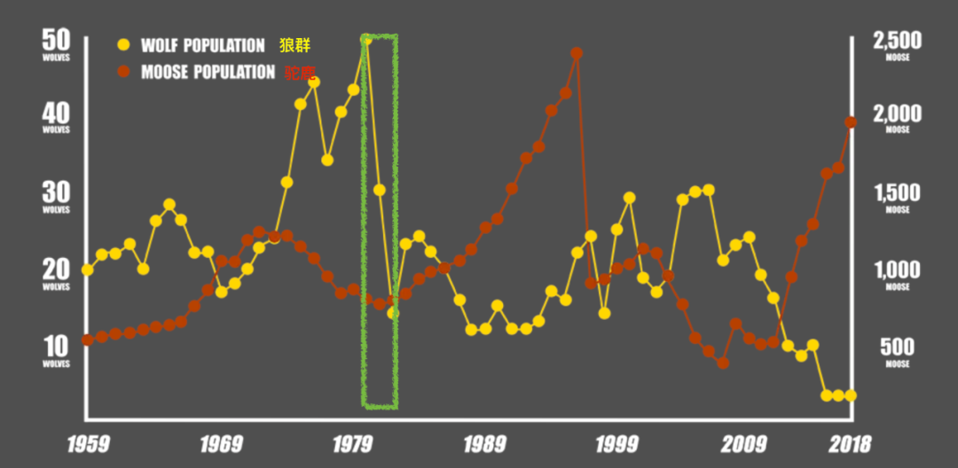 隨着時間的推移,狼的數量略有波動。但是,經過一系列温和的冬季之後,駝鹿的數量增加了近一倍,平衡發生了重大轉變。