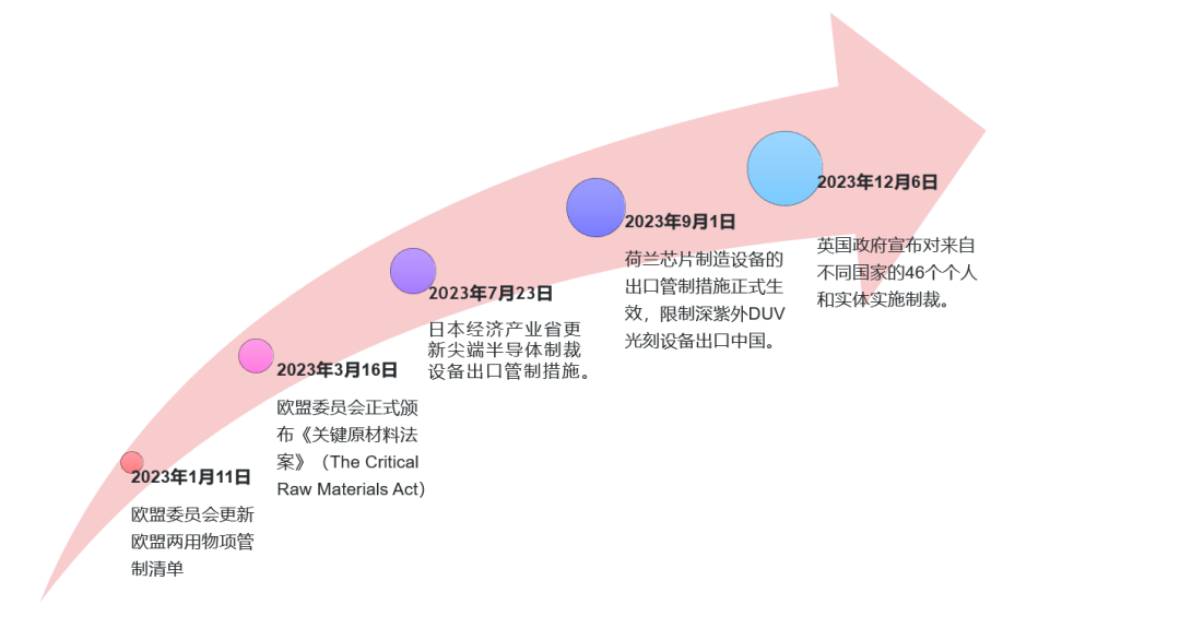 例如美國與日本、荷蘭達成關於半導體領域的出口管制協議共同開展對中國的半導體限制。其中,日本政府於2023年3月31日宣佈修改《外匯及對外貿易法》,擴大半導體制造設備出口管制的範圍,其中包括23種高性能半導體制造設備。7月23日,日本經濟產業省修正其尖端半導體制造設備出口管制措施,將尖端半導體制造設備等23個品類列入出口管理限制對象名單的措施自此正式實施。[2]荷蘭則於2023年6月30日通過《先進半導體生產設備法規》,限制特定高級半導體生產設備的出口。新規定限制最新型號的深紫外(DUV)光刻設備出口到中國,該項出口管制法規在2023年9月1日正式生效。這一規定旨在保護荷蘭在芯片製造業的領先地位,防範關鍵技術外流並用于敏感的軍事領域。