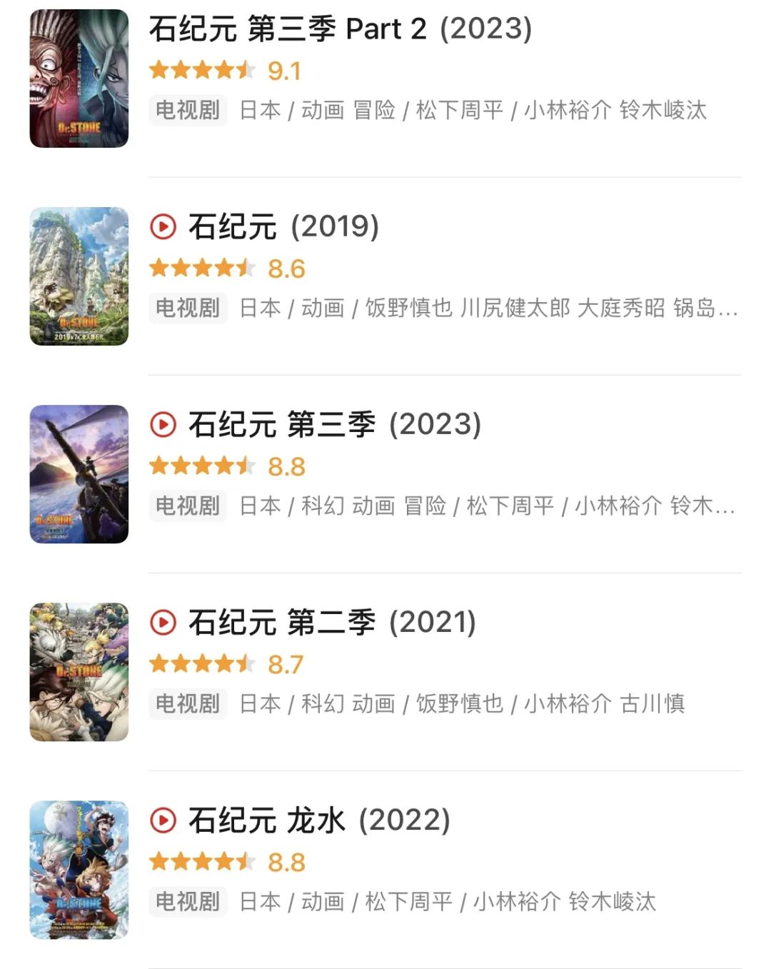 作為在主打戰鬥、運動等少年熱血漫的《JUMP》中頑強求存的科學漫,《石紀元》這種熱度也無可厚非。但從其數次衝過腰斬線,在一眾熱血漫中突出重圍躋身新四大台柱,並且三季豆瓣均分超8.7,MAL和IMBD也超8分來看,也有其值得稱道的地方。