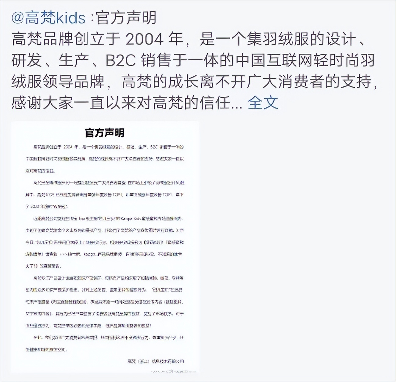 9月28日,高梵kids官方發佈聲明,稱淘寶頭部主播烈兒寶貝在直播帶貨時,不僅帶貨仿冒自家品牌系列的侵權產品,還盜用了高梵的產品宣傳圖片進行直播。