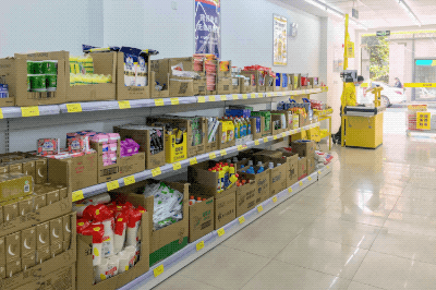 貨架的高度、商品擺放的密度、商品品類都比同等規模普通商超要低,且大部分商品都沒有陳列在架子上,而是直接把包裝箱切到半開的狀態,直接展示給消費者。