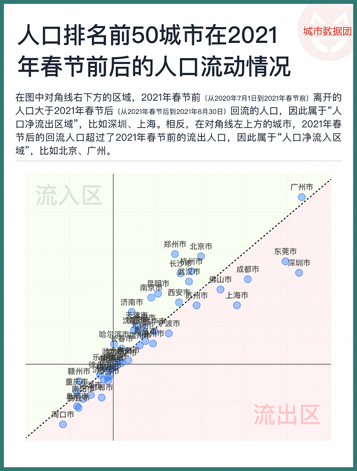 在圖中對角線右下方的區域,2021年春節前(從2020年7月1日到2021年春節前)離開的人口大於2021年春節後(從2021年春節後到2021年6月30日)迴流的人口,因此屬於“人口淨流出區域”,比如深圳、上海。相反,在對角線左上方的城市,2021年春節後的迴流人口超過了2021年春節前的流出人口,因此屬於“人口淨流入區域”,比如北京、廣州。