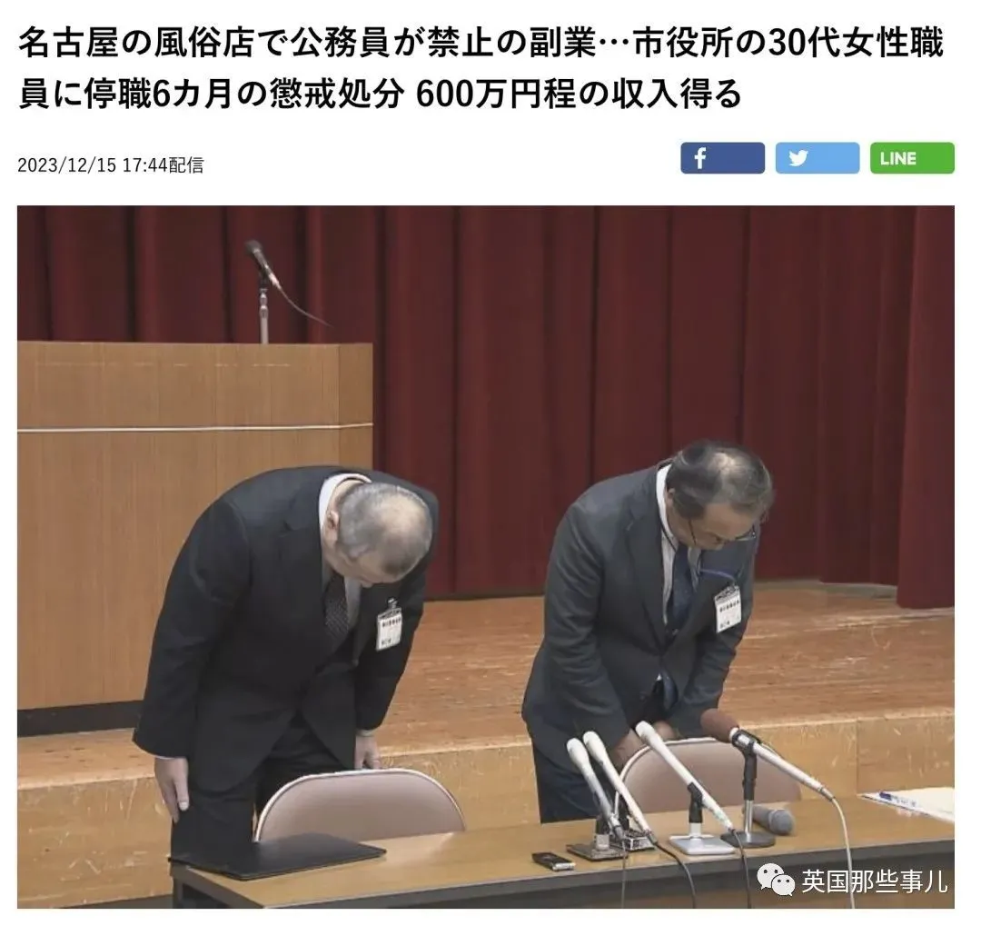 今年12月,三重縣四日市市上下水道局的一名30歲女公務員,被發現在名古屋市的一家風俗店工作長達兩年,總收入約600萬日元(約30.11萬人民幣),被舉報的後果就是停職六個月,而且收到處罰當天就辭職了。