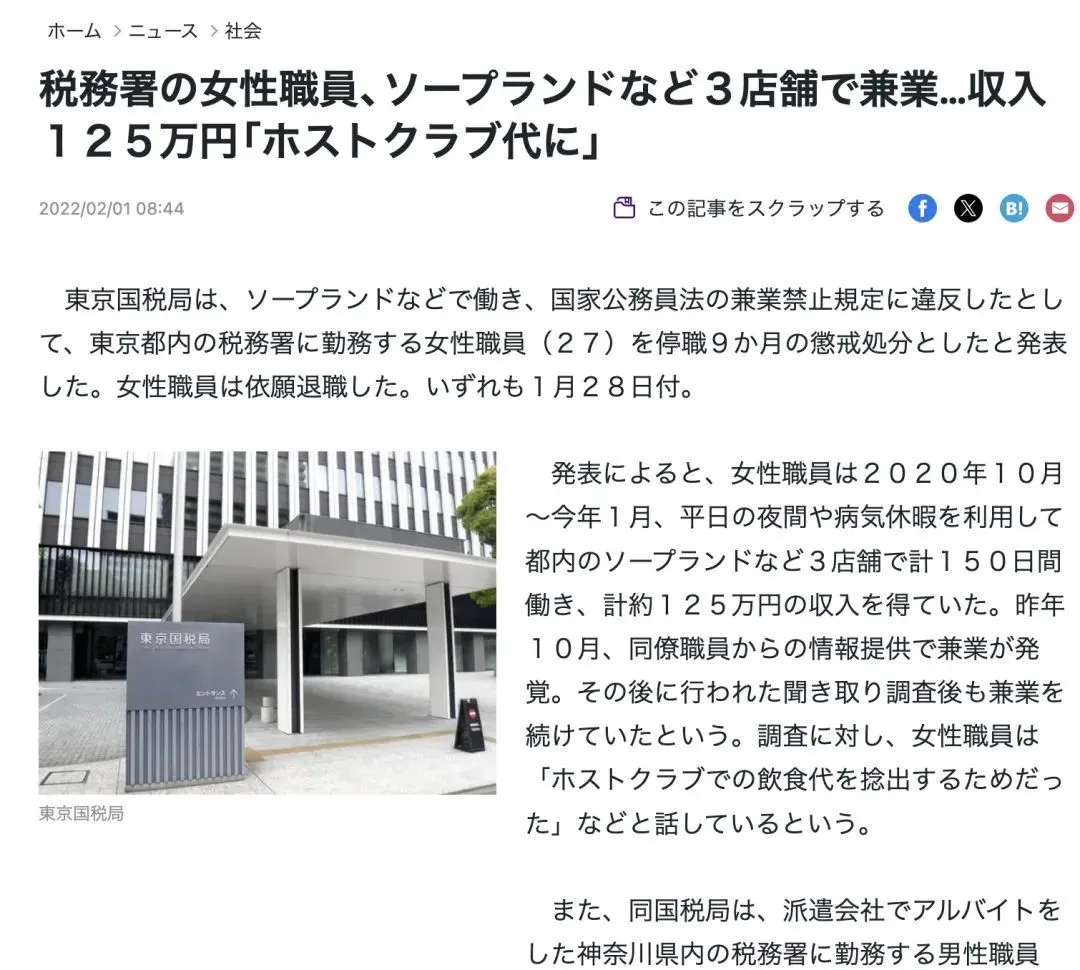 去年12月,前一位的處罰新聞還沒被互聯網遺忘,又有一名東京都税務所24歲女職員被發現在風俗店打工,而且是個兼職狂魔,頭鐵地同時在8家風俗店攬客…