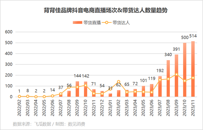 被收購後的背背佳品牌,抖音推廣、小紅書博主合作一樣也沒落下。觀察近兩年背背佳在抖音上的直播場次及帶貨達人的數量變化,發現其從2022年下半年開始數據發生了較大的變化。2023年帶貨直播場次2387場,帶貨達人數量1250人。從2023年8月開始,帶貨直播場次激增,同比增長507%;10月與11月累計達到1014場,相當於平均每天將近17場的直播。帶貨達人數量與直播場次增加基本同頻。