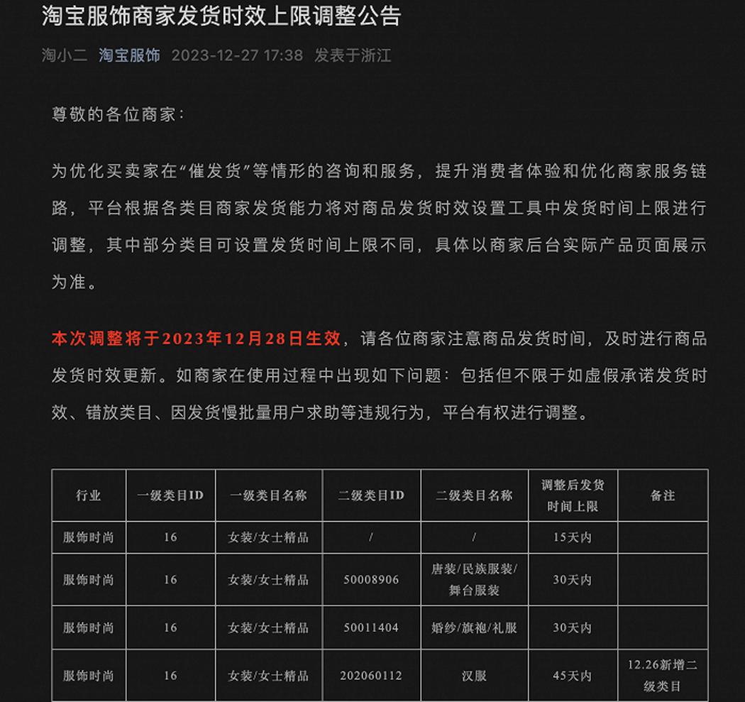 不只是"僅退款”,為了提升核心品類——服飾的用户體驗,淘寶還對大家詬病已久的預售動了刀。淘寶服飾發佈公告,對商家發貨時效上限作出調整,日常女裝等大部分服飾箱包鞋類的發貨時間上限為15天,唐裝/民族服裝/舞台裝、婚紗/旗袍/禮服等類目不得超過30天,漢服類不得超過45天。若因超時發貨被買家發起投訴,商家可能需要賠付。