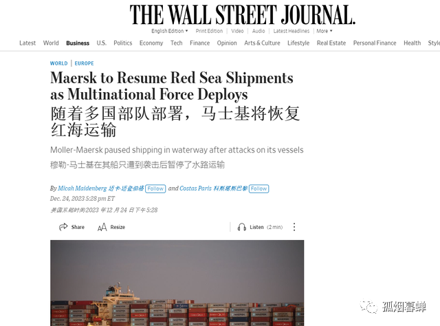 就在我出這期內容的過程中,我在美媒《華爾街時報》上還看到了一條新聞,説是丹麥航運巨頭馬士基集團已經計劃恢復他們的紅海航線了。儘管《華爾街時報》仍在試圖帶節奏,聲稱馬士基之所以敢於重走紅海航線,主要是拜“繁榮衞士行動”的功勞所賜,但實際情況大家都心知肚明。那些只不過是美國的輿論戰宣傳機器炮製出來,為美國領導下的那個也已離心離德的、所謂的“基於規則的國際秩序”挽尊的場面話罷了。