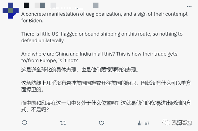 説回法意西三國拒絕參加美國主導的“繁榮衞士行動”一事,國外社交媒體上的討論熱度還不低。以推特(現在叫X)為例,現在推特上有不少英文用户都在就這樁新聞各種冷嘲熱諷,其中不乏標榜自己是美國人的英文用户。雖説是美國網民,但這些人吐槽起拜登政府和他們的那個“繁榮衞士行動”來,那力度可比其他國家的網民狠多了。