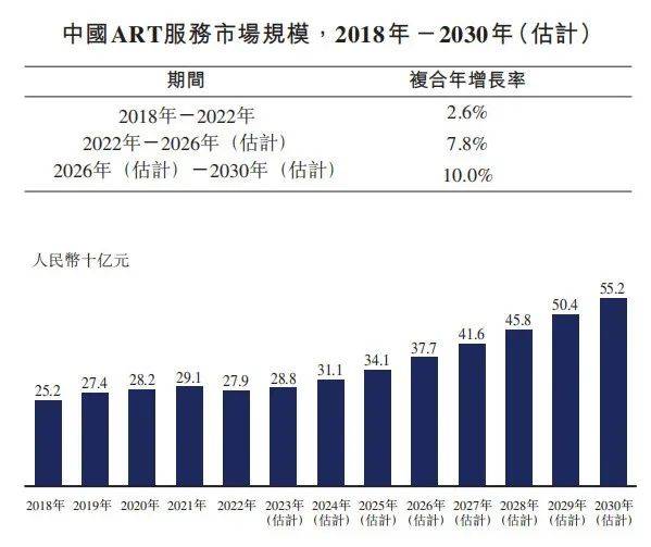 正因如此,在不孕不育人口數上升的背景下,近幾年國內ART市場規模幾乎停滯增長。數據顯示,2018年國內ART服務市場規模為25.2億元,到2022年國內ART市場規模僅略微增長至27.9億元。