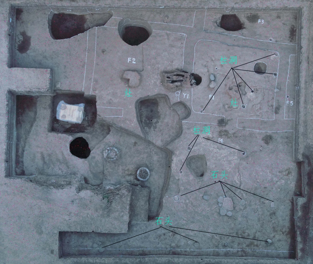 遺址內發現居住建築形式多樣。除2021年度發現的地面式方形建築、“呂”字形半地穴建築,圓形深穴式建築外,2022年度新發現有使用土坯的窯洞式建築,兩個居室與一個院落的半地穴建築組合,及一處可能與建築相關的人工夯土台基等。編號F9的房址遺存為一處包含兩個圓角方形的側室及及一個橢圓形院落的半地穴院落建築,院落平面形狀為橢圓形,壁面較光滑、陡直,部分牆壁有泥抹痕跡,底部平坦,有不連續的少量白灰面。東南部有兩級生土踏步,應為院落出入口。後室平面形狀為方形,門道向東,有三級生土踏步。房間中部有一處火燒圓形灶面,西南部有一較完整的龜甲,房間內還發現有三件紅陶柱狀陶器。側室平面近方形,門道向南,房間中部有一曲尺形燒土範圍,中部有一處橢圓形火種坑。
