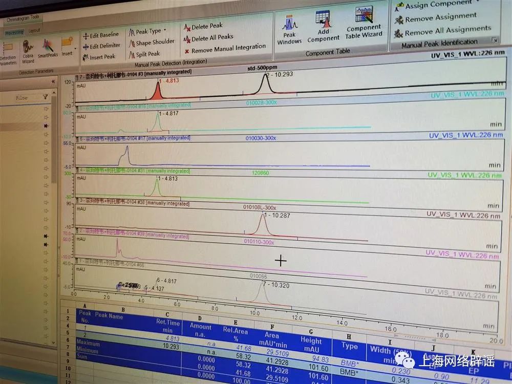 △檢測人員出示了多份樣品的檢測結果。圖上最上端為正品的成分圖譜,兩個“峯”分別為“奈瑪特韋”和“利托那韋”,往下數第三條為“奧司他韋”的成分圖譜。