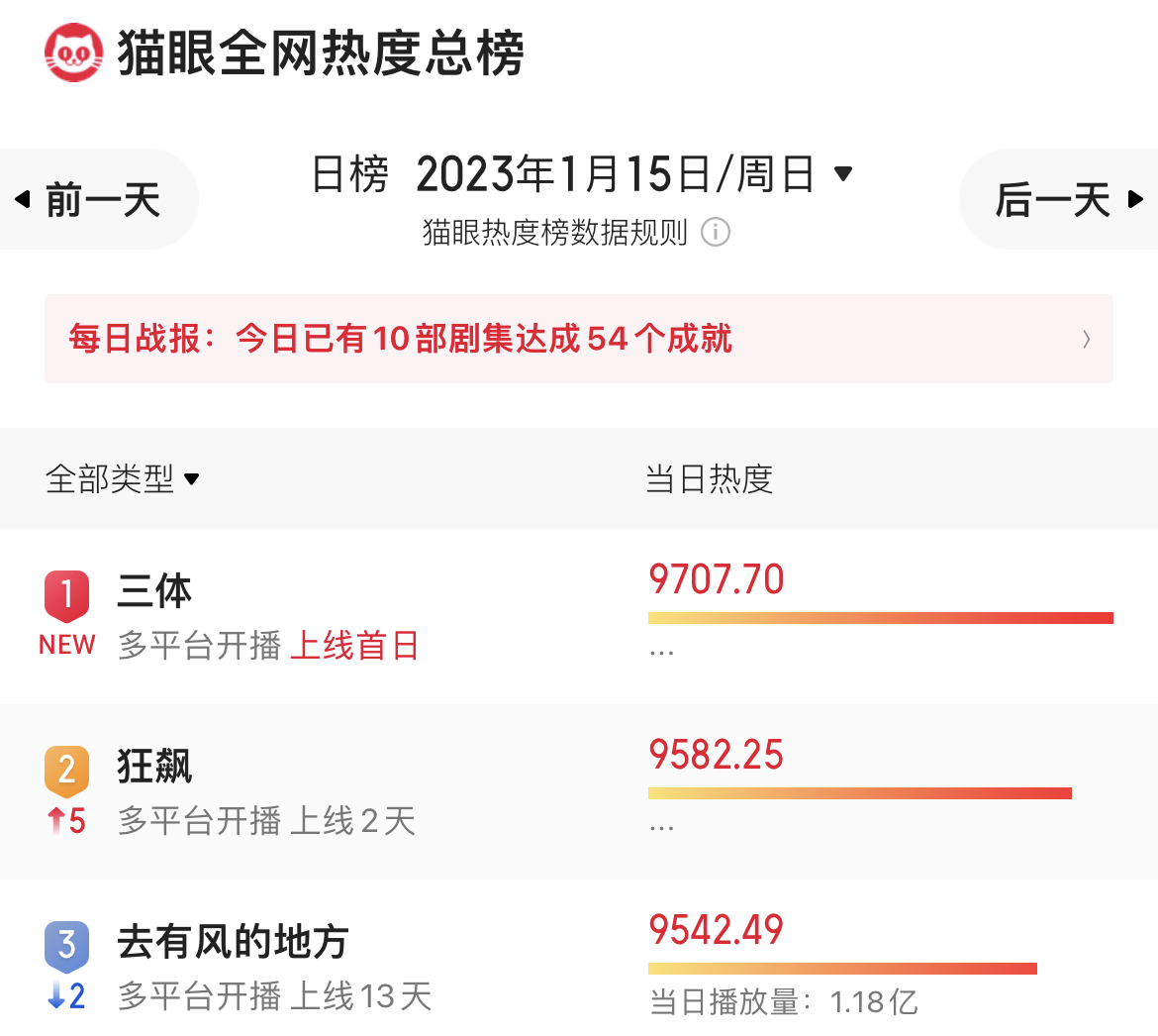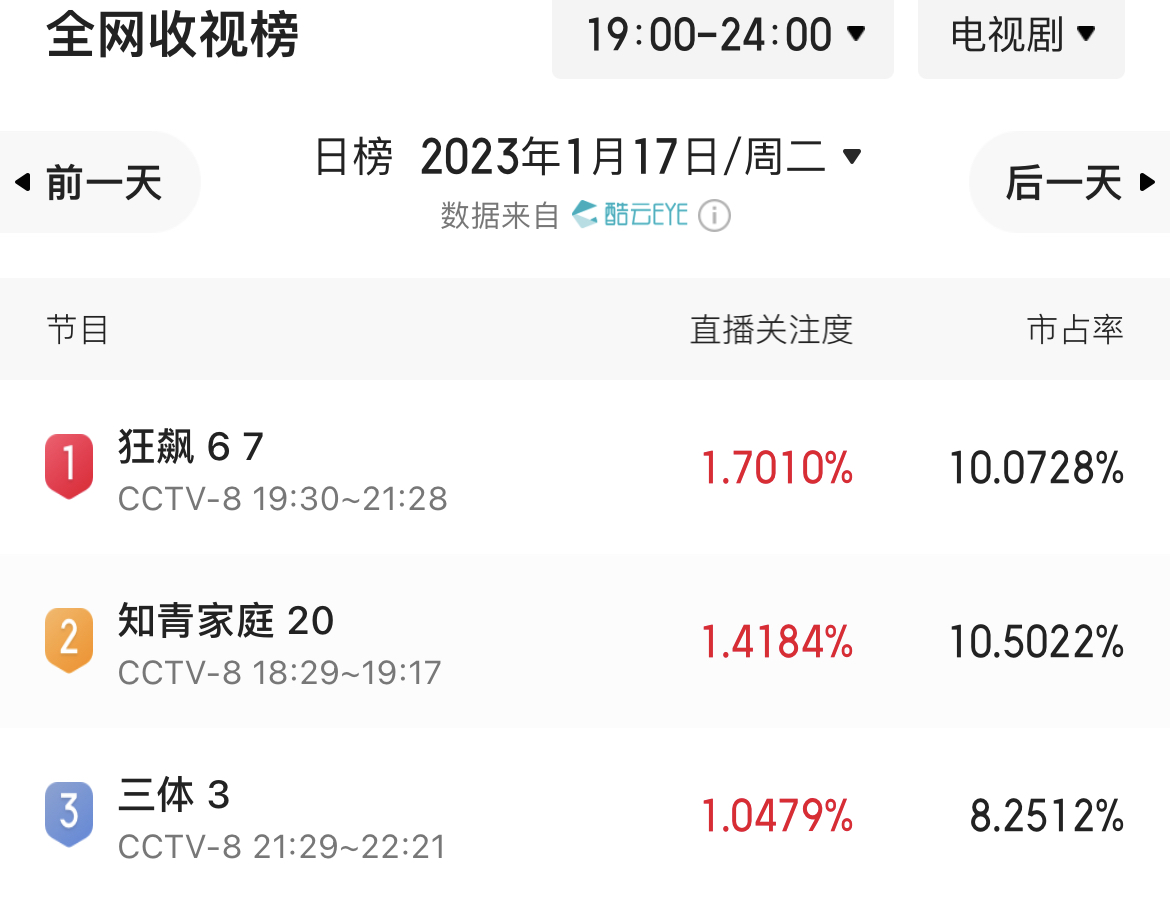 1月14日開播至今,《狂飆》已經連續4天登頂全國黃金時段收視榜,收視率力壓緊隨其後開播的熱門劇《三體》,但全網討論熱度不及後者。