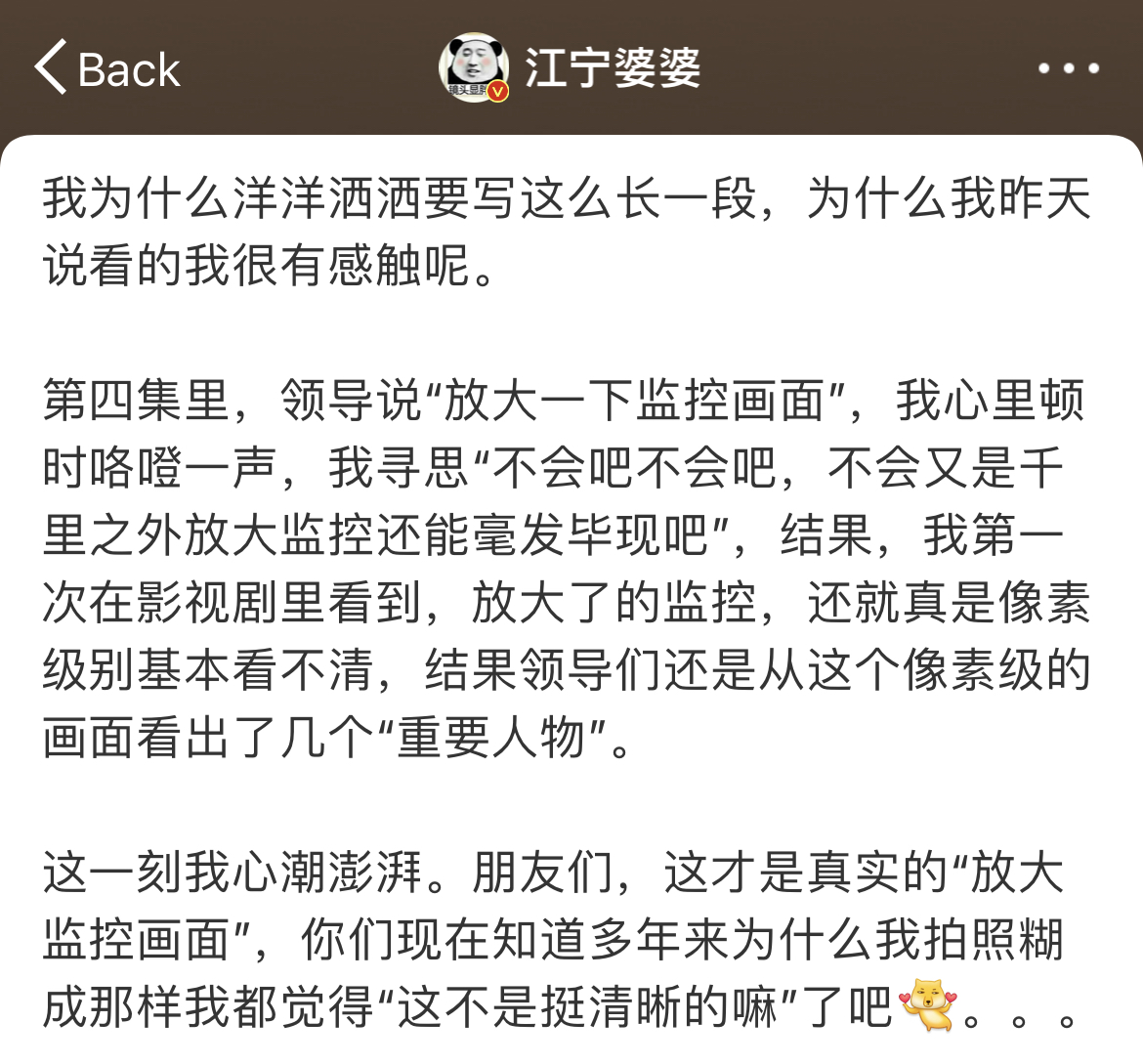 最讓@江寧婆婆 驚喜的是,他第一次在影視劇裏看到,警察放大了的監控“還就真是像素級別基本看不清”,“這一刻我心潮澎湃。朋友們,這才是真實的‘放大監控畫面’”。