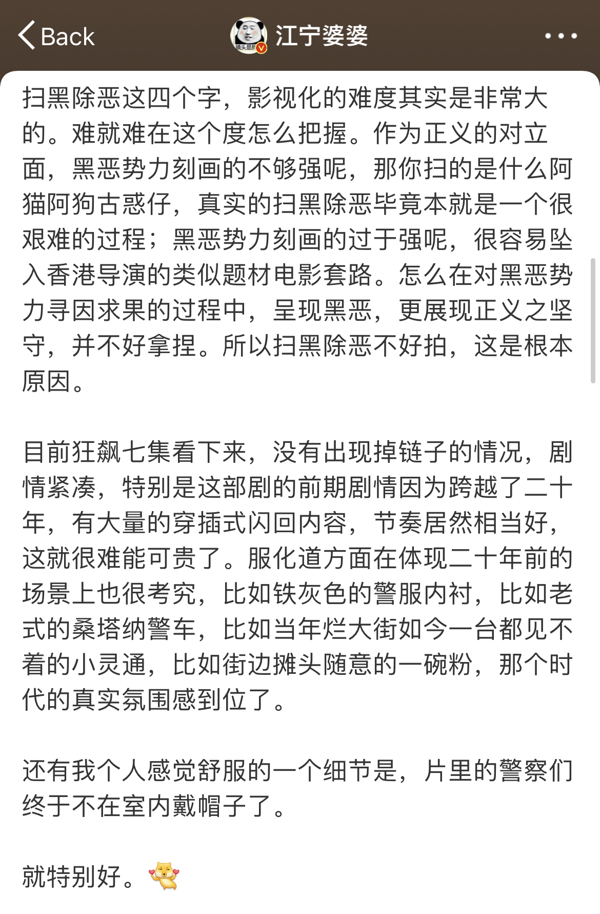 掃黑劇《狂飆》開篇,就用尺度和節奏讓觀眾屏住了呼吸,細節還原到連民警博主@江寧婆婆 都直誇,看到放大監控畫面的一瞬間,他“心潮澎湃”。