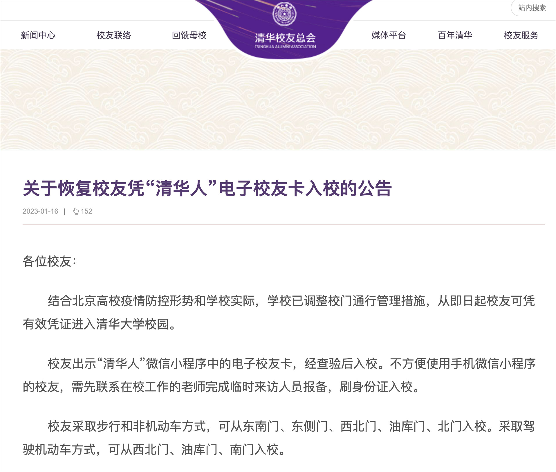 1月16日,北京大學、清華大學相繼發佈通知,即日起,恢復校友免預約出入校的權限。