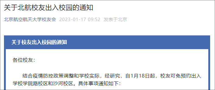 1月17日,微信公眾號“北京航空航天大學校友會”發佈通知:結合疫情防控政策調整和學校實際,經研究,自1月18日起,校友可免預約出入學校學院路校區和沙河校區。